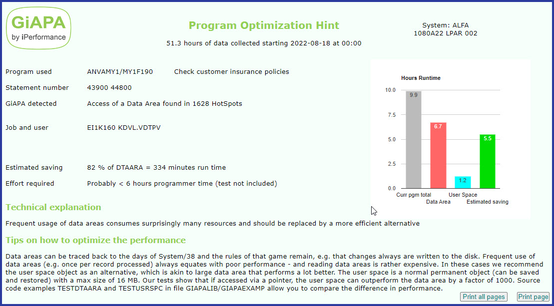 The easiest way to locate performance optimization potential is selecting option 20 from the GiAPA Menu and run the fully automatic performance analysis on data collected and expanded/analyzed. Both the data collection and the analysis runs in unattended batch - no performance expertise is needed on the user side.